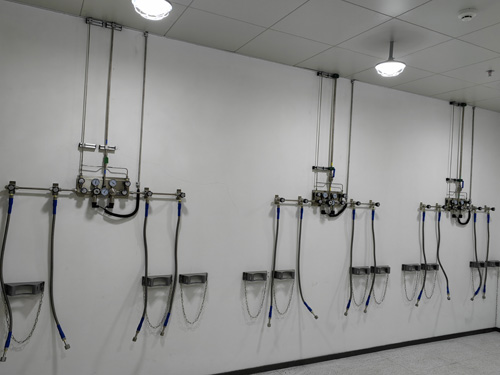 8.氣瓶間內的混合氣體瓶與阻力調試器之中按照SS316L進行超高電壓合金軟水管對接手段無融合。進行超高電壓軟水管為軟質軟水管,以絕對對接手段的便宜性。并自導或許防護鋼纜,預放特別問題下,瓶閥故障等物理現象造成 的進行超高電壓“抽鞭”事情。阻力調試器與途徑的對接手段手段為雙環卡套。